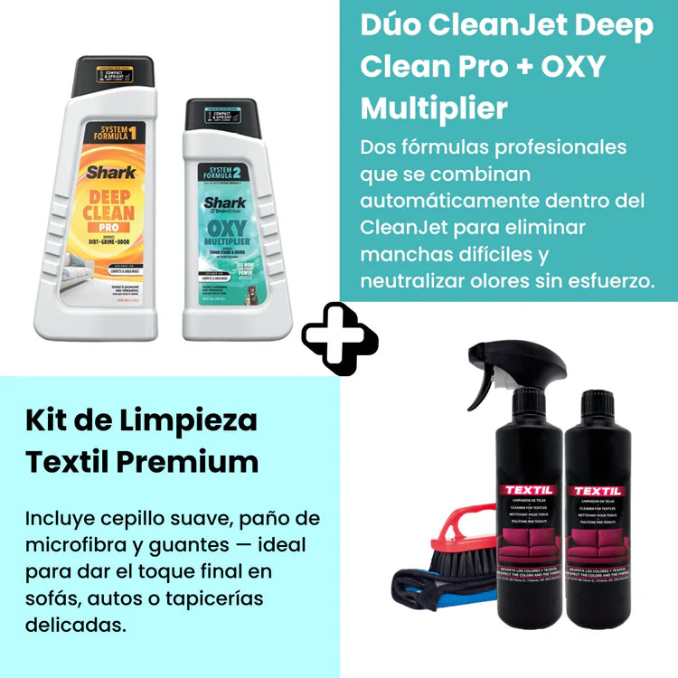 Potencia tu CleanJet conn el dúo de fórmulas activas y el kit textil premium.