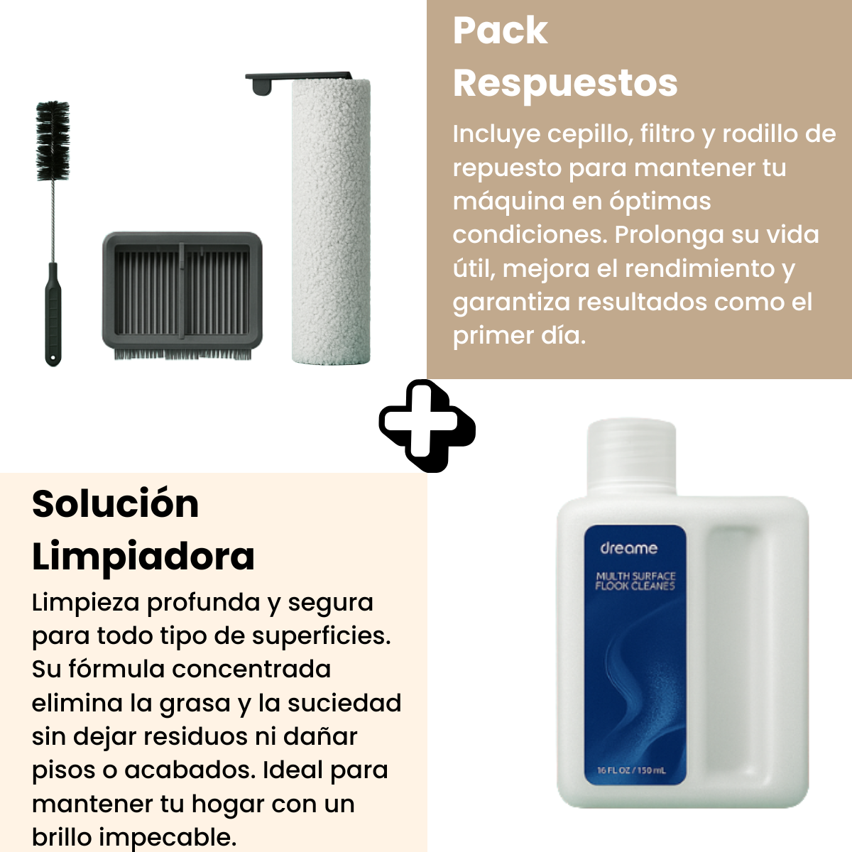 El rodillo y los filtros son lavables y puedes reemplazarlos fácilmente (tu compra incluye un kit de repuestos + solución limpiadora gratis).